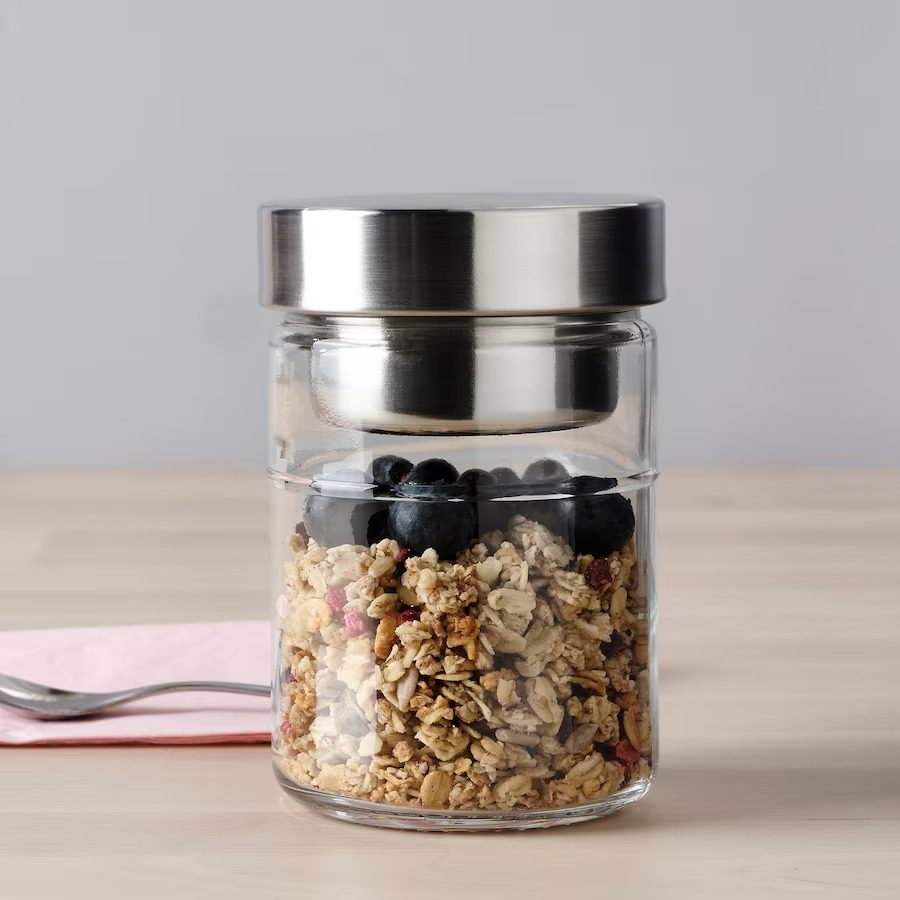 بانکه محفظهدار ایکیا DAGKLAR یک ظرف کاربردی، زیبا و مناسب برای نگهداری مواد غذایی خشک است. این بانکه با طراحی شفاف و درِ محکم، امکان مشاهده آسان محتویات را فراهم میکند و از نفوذ هوا و رطوبت جلوگیری میکند؛ بنابراین گزینهای ایدهآل برای نگهداری اقلامی مانند حبوبات، ادویه، آجیل، قهوه، چای، بیسکوئیت و سایر مواد خشک است.