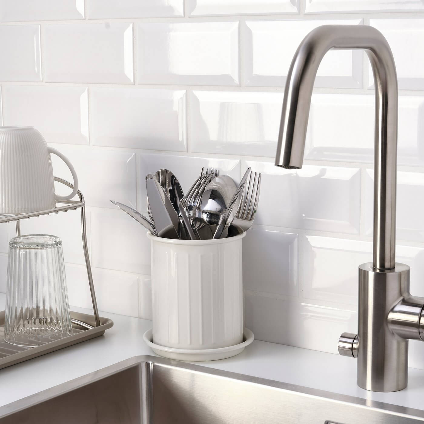 جا قاشقی VALVARDAD ایکیا با طراحی ساده و صنعتی، انتخابی کاربردی و بادوام برای نگهداری قاشق، چنگال و ابزار آشپزی است. ترکیب فلز گالوانیزه مقاوم با رنگ سفید ظاهری مدرن و تمیز ایجاد کرده و بهراحتی با انواع دکور آشپزخانه هماهنگ میشود. ارتفاع ۱۳ سانتیمتر آن فضای مناسبی برای نگهداری ابزارهای پرکاربرد فراهم میکند.